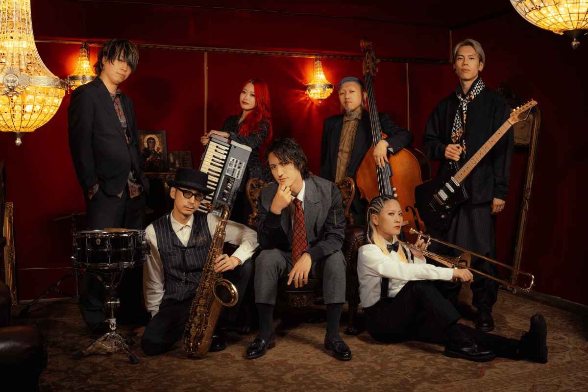 (L↔︎R) Dr.TAM , Sax.RYO AIBA , Key.MITAN , Vo.YUTARO , Ba.YUSUKE KIMURA , Tb.KANACO , Gt.SOW